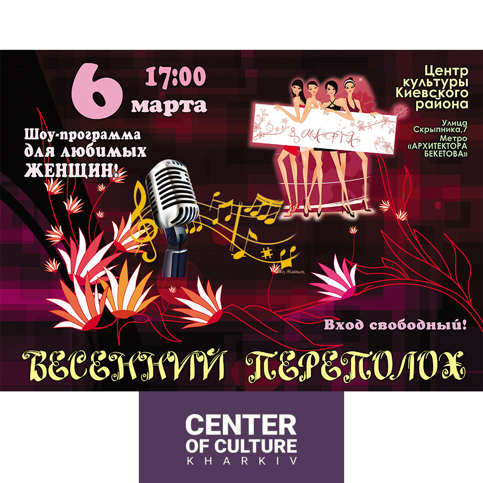 Несмотря на то, что за окном бушует настоящая зима, у нас в душе уже цветёт весна! Мы с удовольствием хотим поделиться весенним теплом и настроением с Вами! В преддверии 8 марта в Центре Культуры Киевского района пройдёт праздничная программа «Весенний переполох». В 17:00 коллективы центра культуры подарят каждому зрителю частичку себя и наполнят зал праздничным настроением!